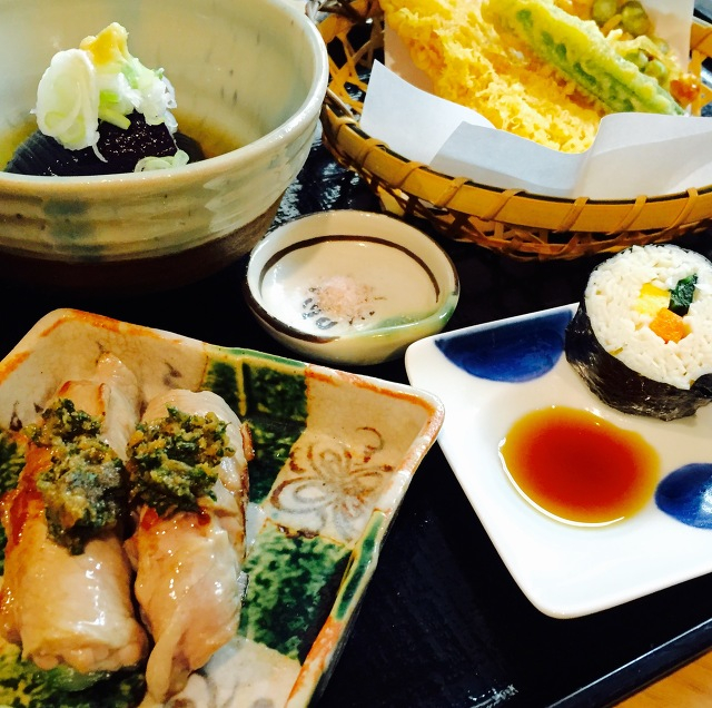 季節の天ぷら盛り合わせ、小鉢料理、蕎麦寿司、