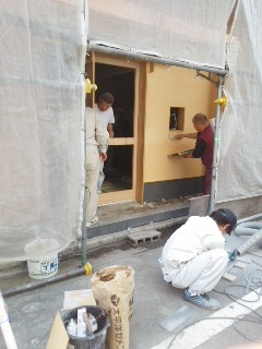 写真は仕上げ段階の正面の壁塗りと扉付けです。