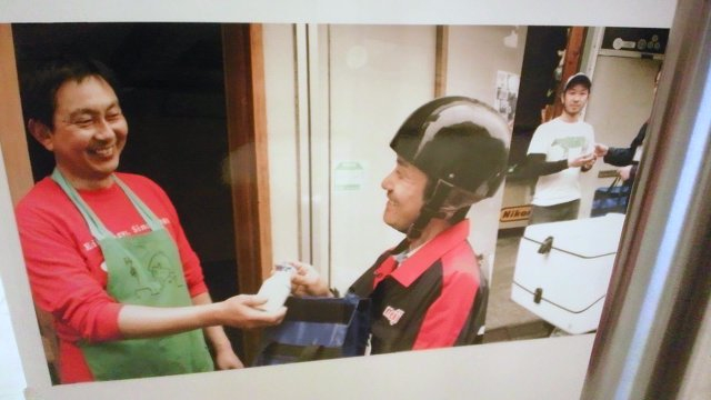 右の写真はソラマチ5階、墨田区観光協会フロア、明治牛乳販売ブースに飾られています。配達中の明治牛乳販売員さんと砂場店長の笑顔の絡み。
